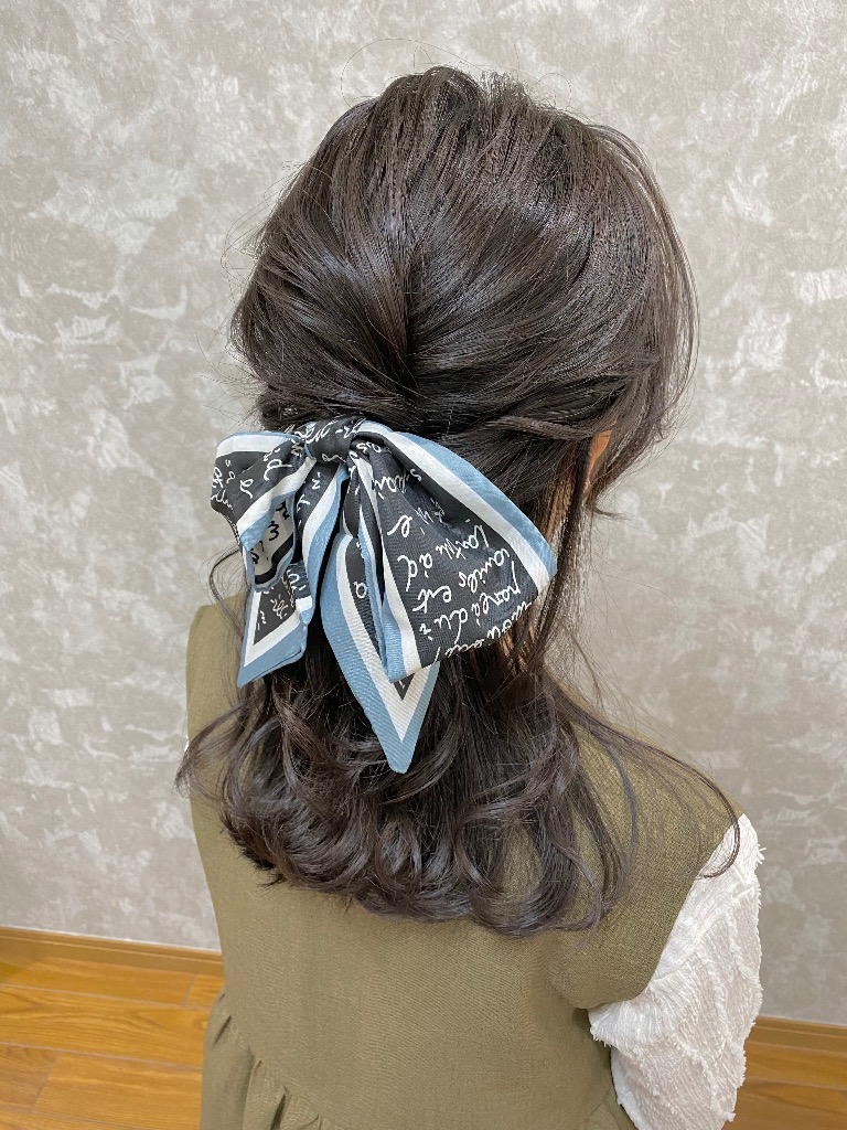 シンプルなハーフアップでも、スカーフをプラスするだけで
