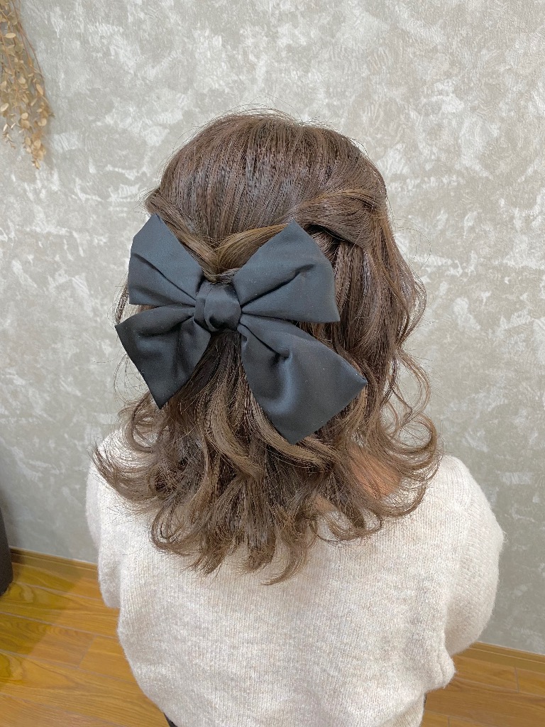 ハーフアップのようで前から見ても上だけアレンジで下ろしている風